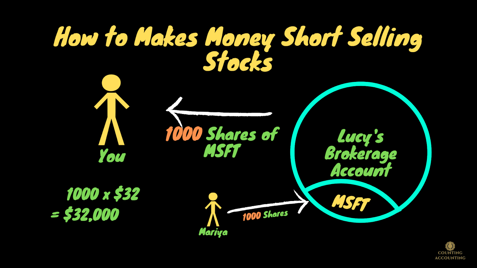 Let's say that you're looking at selling short Microsoft so MSFT that's the ticker symbol for Microsoft. Let's say that the stock price is currently trading at $32 a share and so you think that the price of Microsoft is going to go down. Now there could be any number of reasons that you believe that let just says that you think that cloud computing is just going to devastate Microsoft's business model and that they're just gonna have all kinds of problems and that their business is just gonna fall apart the stock price is going to go down. So you call a broker to let's say you call "Lucy" the broker here and you say "I want to short 1,000 shares that just slang for saying you want to sell short a thousand shares.