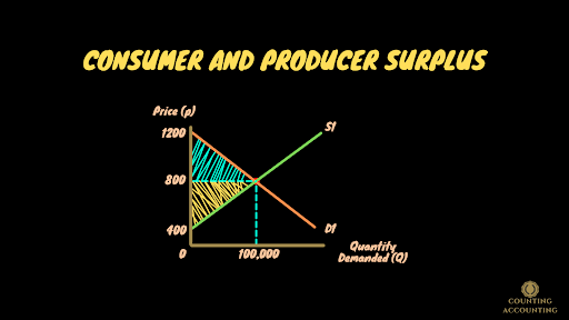 Now the producer surplus, we're just thinking about the cost of producing the good deducted from the amount that the producer receives. So let's say that there's a producer that makes drum kits right so they make drum kits for people to play the drums and stuff for a band. It costs them $300 to produce a drum kit but they sell the drum kit for $700. So now we see that there is a minimum cost that they needed to break even would have been $300 but they actually get $700 for the drum kit. We would say that the difference there which you can think about is profit or however you want that is producer surplus of $400 and so we can actually calculate the consumer surplus and the producer surplus for all the consumers and all the producers in the market.