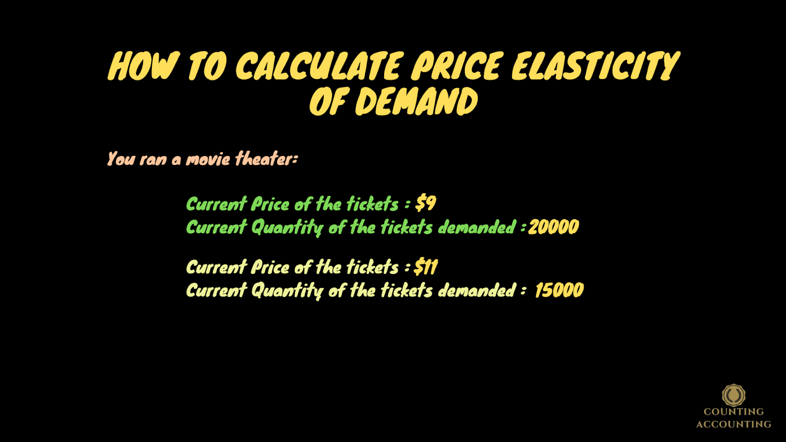 Let me give you a more little more complicated example to show you how you calculate this in the real world. So let's say that you run a movie theater and the current price of a ticket is $9 and that price people want to buy 20000 movie tickets but you're considering a price change, you're wanting to know "What would happen if I increase the price by $2?" Let's say you talked to somebody who really knows the movie theater industry and they say "Look if you increase the price to $11 which is that $2 increase then that is going to decrease the number of tickets that are demanded to 15000 tickets." So an increase of two dollars is going to lead to a decrease of five thousand tickets. Now you want to know how is this going to affect business and so forth. So you could just look nine dollars times twenty thousand (9 x 20000) you originally had 180,000 in sales and now you've got eleven times fifteen thousand (11 x 15000) and you've got 165000 in sales.