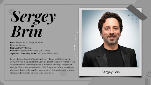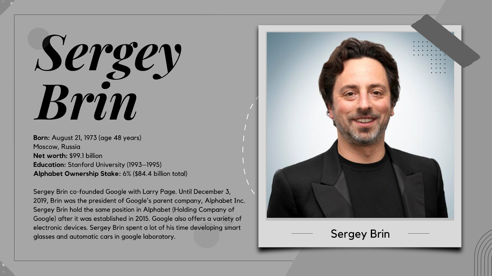 Sergey Brin co-founded Google with Larry Page. Until December 3, 2019, Brin was the president of Google's parent company, Alphabet Inc. Sergey Brin hold the same position in Alphabet (Holding Company of Google) after it was established in 2015. Google also offers a variety of electronic devices. Sergey Brin spent a lot of his time developing smart glasses and automatic cars in google laboratory.
